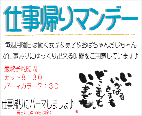 12月も毎週木曜日は45歳以上の女性全メニュー(ポイントカット除く)30%off♪ パーマもカラーもアルカリ抑えた優しい薬品なので同時にできますよ〜〜(^0^)/ そして年末年始のお休みは 12月31日(月)〜1月2日(水)の3日間です。 2012年あともう少しですが【気持ちいい】を最後までお届けしていきたいと思っています。 では、良い年末を〜〜〜〜〜(^0^)/♪